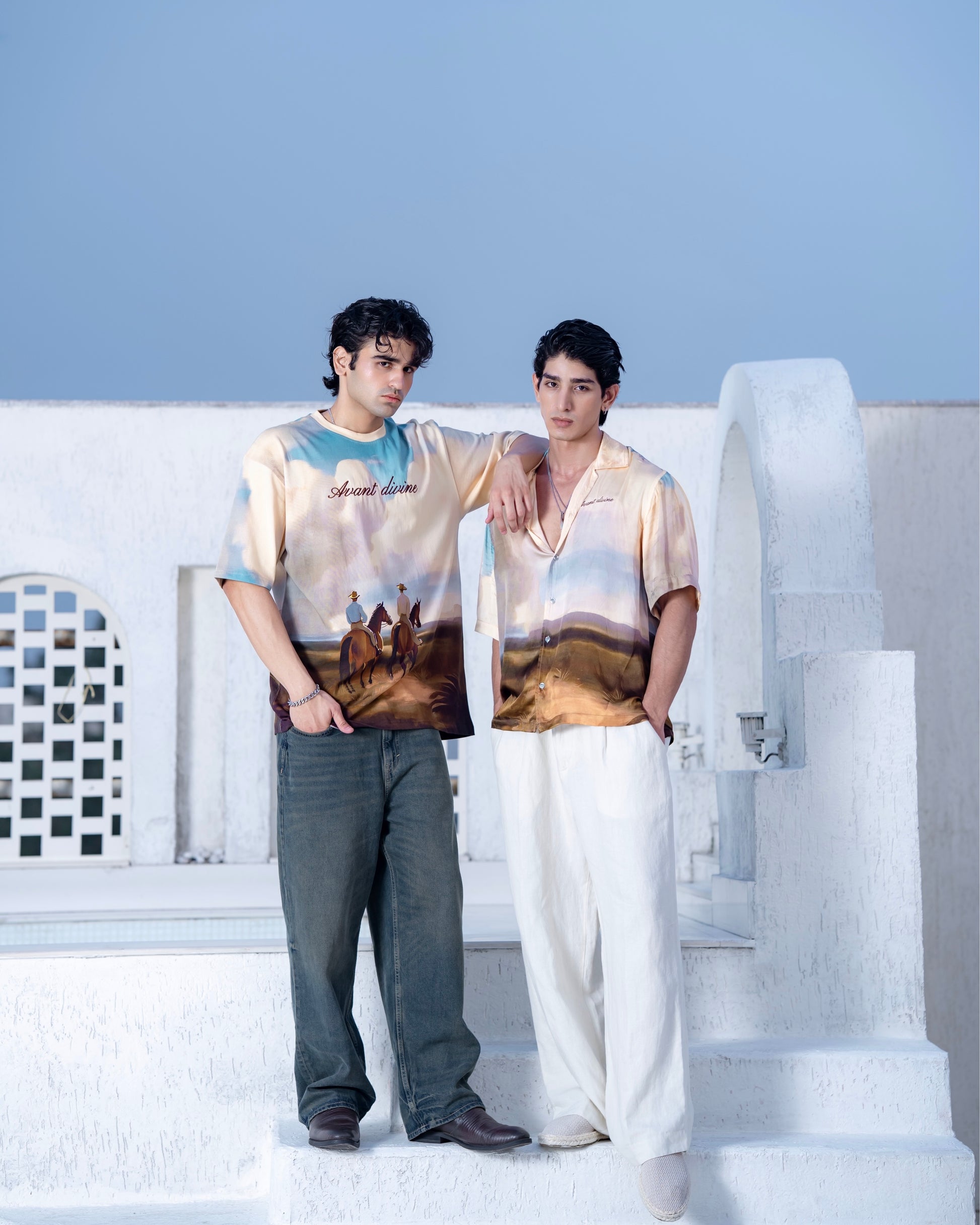 • The Golden Hour Silk Shirt is a vision of movement and light, designed to capture the richness of twilight. Tailored in 100% satin silk with a fluid, luminous drape, the shirt carries an all-over placement digital print from Avant Divine’s debut collection. At the back, a striking horse artwork stands as a symbol of strength and transcendence, while Avant Divine is delicately embroidered on the chest—a subtle signature of quiet luxury. Cut in a relaxed unisex silhouette with a cubbon collar, this piece merges art with attire, designed for those who wear boldness with ease.